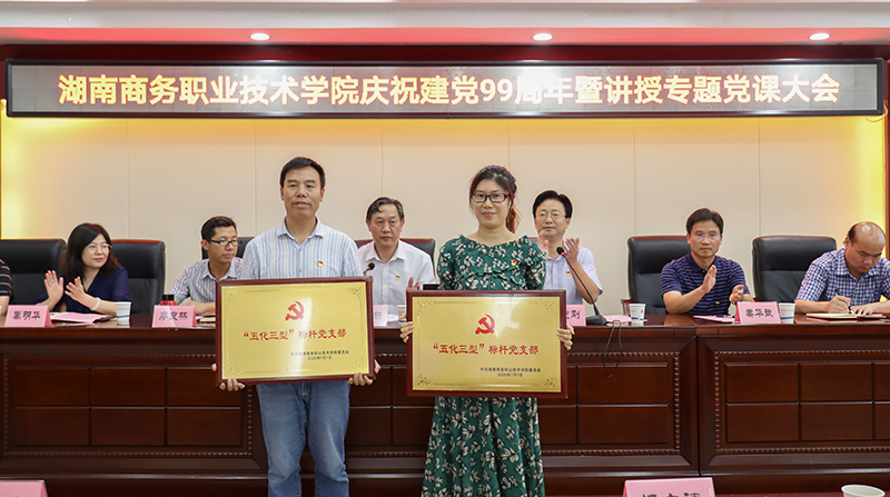 党课开始前,党委副书记廖志刚宣读了《关于确定学校“五化三型”标杆党支部培育对象的通知》,确定旅游管理学院教工党支部、会计学院学工一党支部为学院第一批“五化三型”标杆党支部,并现场为他们授牌。副校长禹明华带领全体参会人员重温了入党誓词。