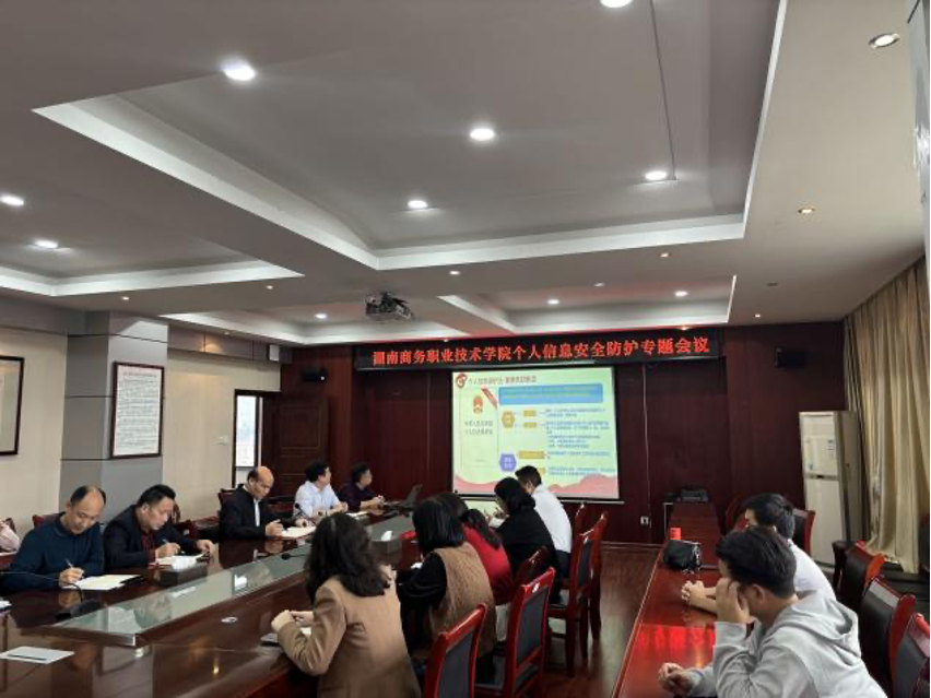 会上,实训与信息管理中心主任毛政珍深入解读了《网络安全法》《个人信息?;しā返暮诵囊?,并结合当前严峻的网络安全形势,通过一系列真实案例进行了生动剖析。为系统化加强个人信息全生命周期管理,规范信息的收集、存储、使用、传输、共享及销毁各环节,会议重点讨论并审议了《湖南商务职业技术学院个人信息安全防护制度(草案)》,与会人员积极建言,进一步完善了制度内容。