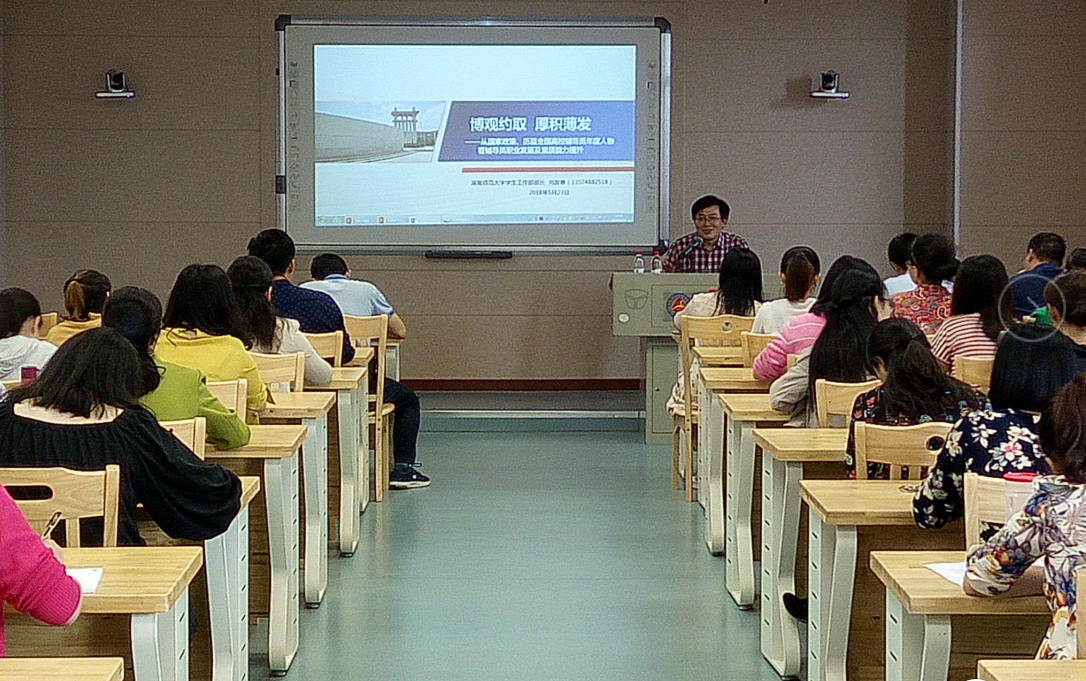 5月23日下午,湖南师范大学学生工作部向发意部长应邀来我院作“博观约取.厚积薄发——从国家政策.历届全国该校辅导员年度人物看辅导员职业发展及素质能力提升”的专题培训讲座。学院副院长廖良林出席本次讲座,学生工作部部长唐柳荷主持,各二级学院总支书记、学管干事、全体辅导员以及长沙职业技术学院的部分辅导员等60余人参加了本次讲座。