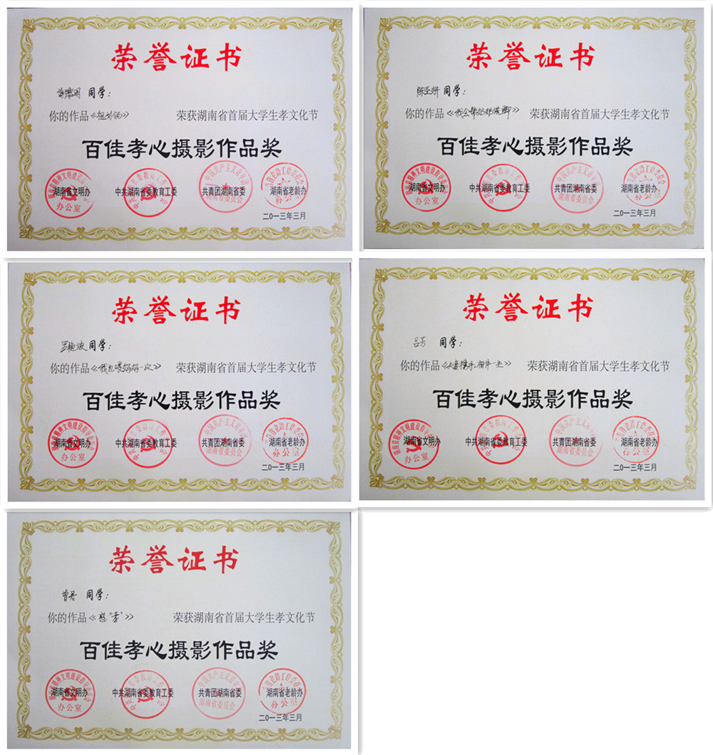 10级会计3班罗艳波《我也喂妈妈一次》、11级电商3班谢黎明《祖孙俩》、11级文秘2班曾君《感“孝”》、11级会计16班陈圣妍《我会帮妈妈洗脚》、吕芳《夫妻携手,相伴一生》5名同学荣获“百佳孝心摄影作品”奖