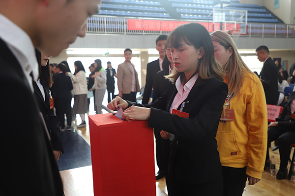 会中,第四届团委学生增补选委员候选人、第十六届学生会委员候选人集体亮相并分别作自我介绍。现场由总监票人向各代表团分发选票并组织投票,并由学工处谷永林老师宣布当选结果:黄冰凤、卢一慧等18位同志增补选为校团委第四届委员,王琼等18位同学当选第十六届学生会委员。新当选学生会委员王琼代表全体团学代表向全校青年学生发出倡议:倡议全校共青团员、青年学生坚定理想信念,共建和谐校园;要勇于创新实践,推进素质教育;练就过硬本领,争当先进模范。