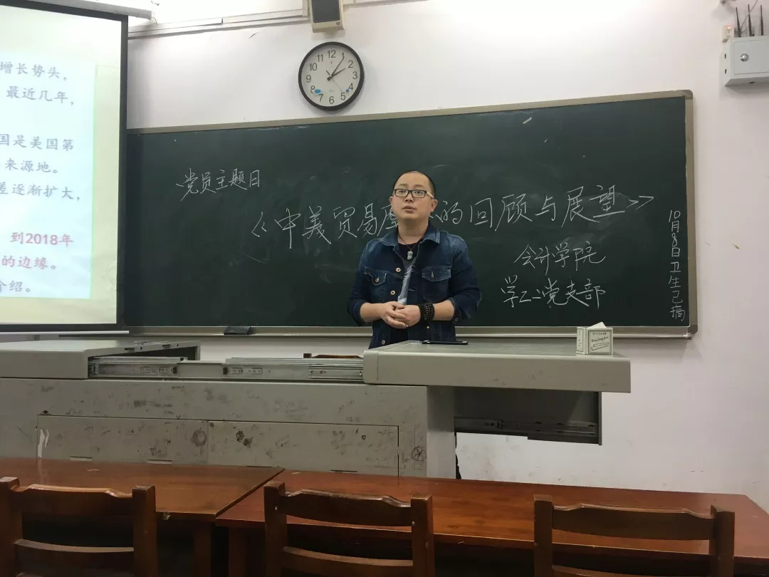 2018年10月9日下午14:00在J2-202举行了主题党日活动,党日活动的主题为“中美贸易摩擦的回顾与展望”,会计学院学工二支部林达同志主持了本次党日活动。