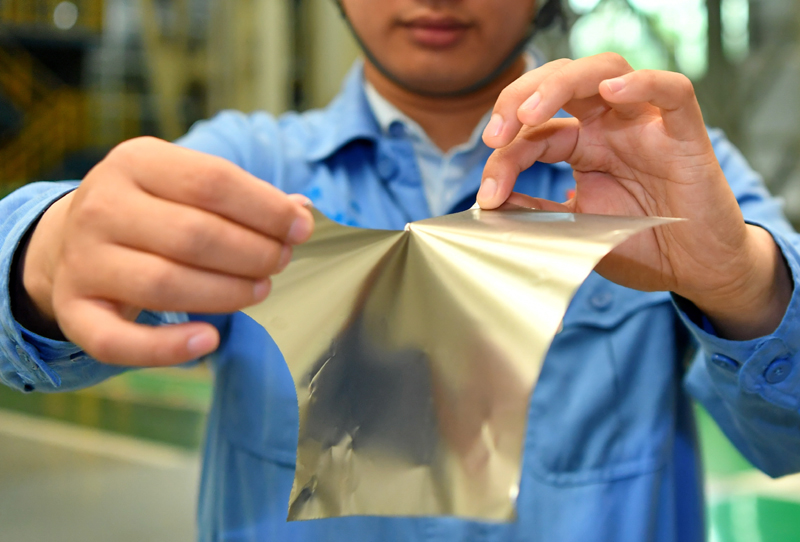 在位于山西的太钢集团,员工展示用手撕开0.02毫米厚的超薄带状不锈钢(2019年5月24日摄)。(新华社记者 曹阳/摄)