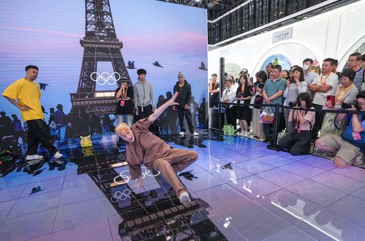 2024年9月14日,在2024年服贸会国家会议中心综合展区的主宾国法国展台,中法两国街舞好手在表演霹雳舞。(新华社记者 陈晔华/摄)